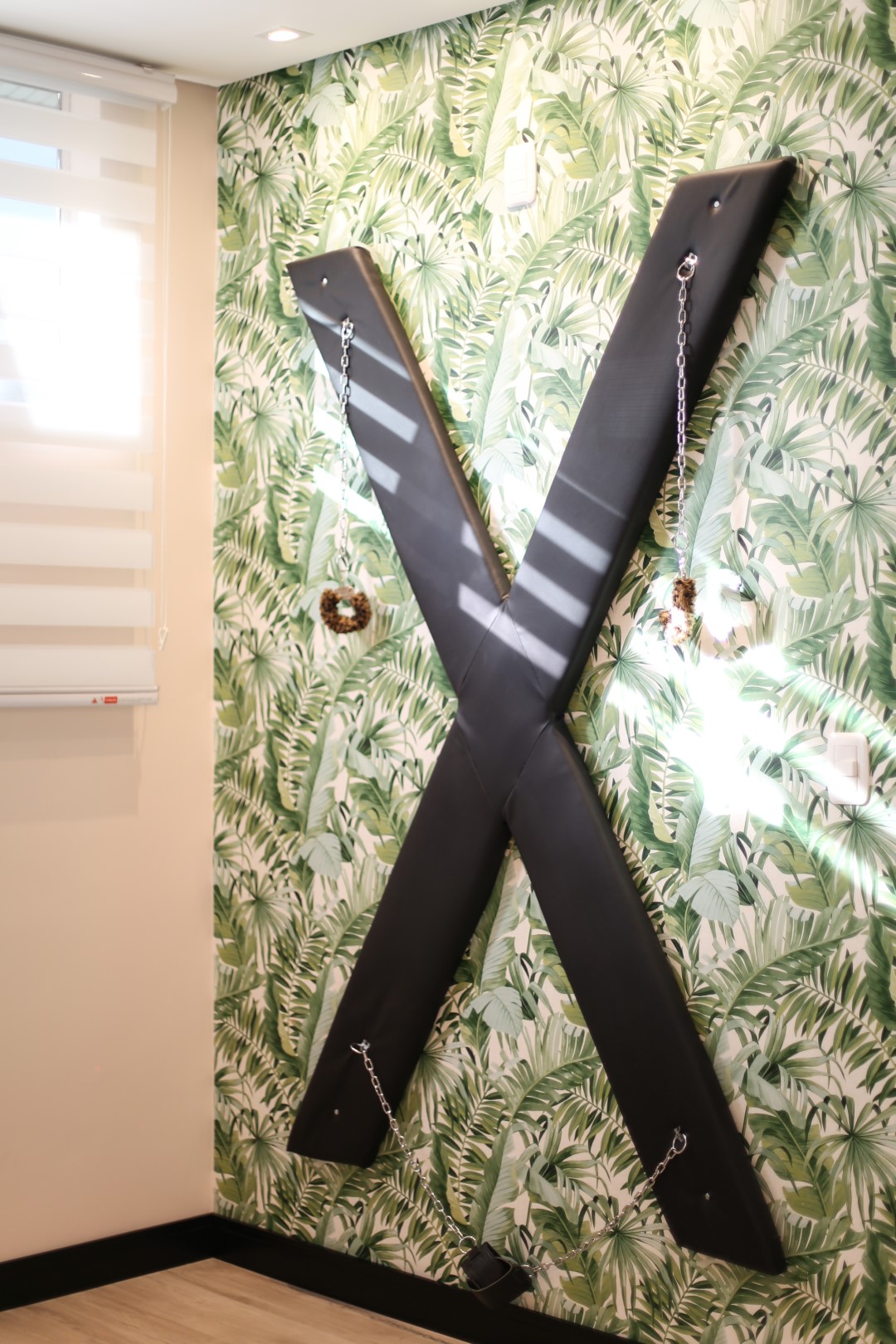 “X” sado com algemas, ar condicionado, calefação, frigobar, canais eróticos, espelho de teto, canais de som com entrada USB, internet Wi-Fi, TV smart, secador de cabelo, chuveiro de teto e garagem privativa.