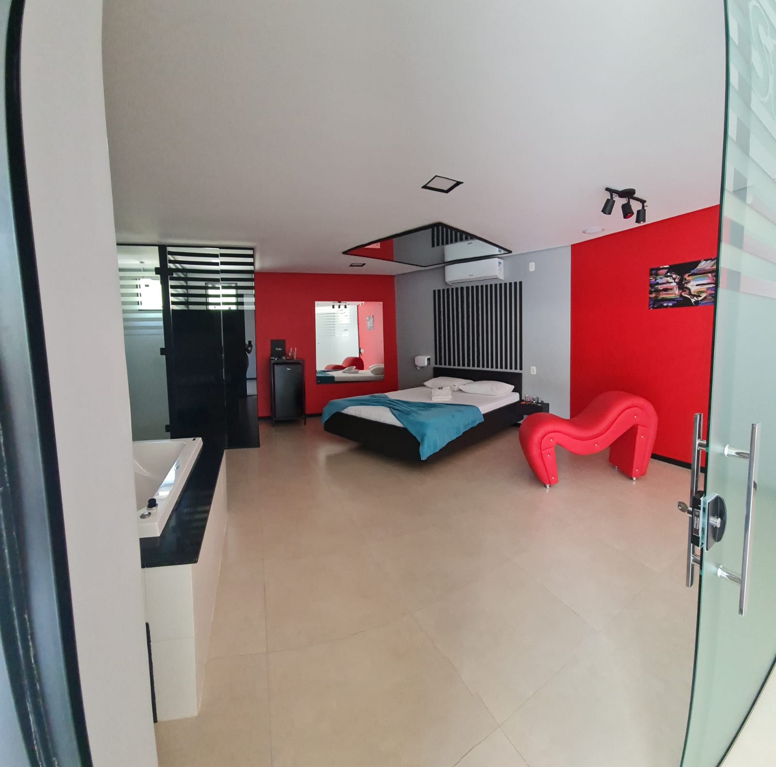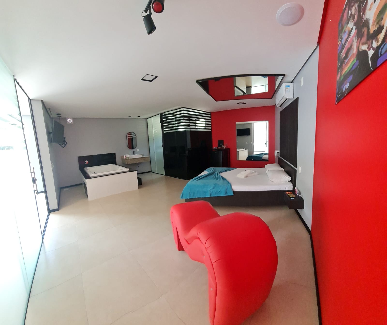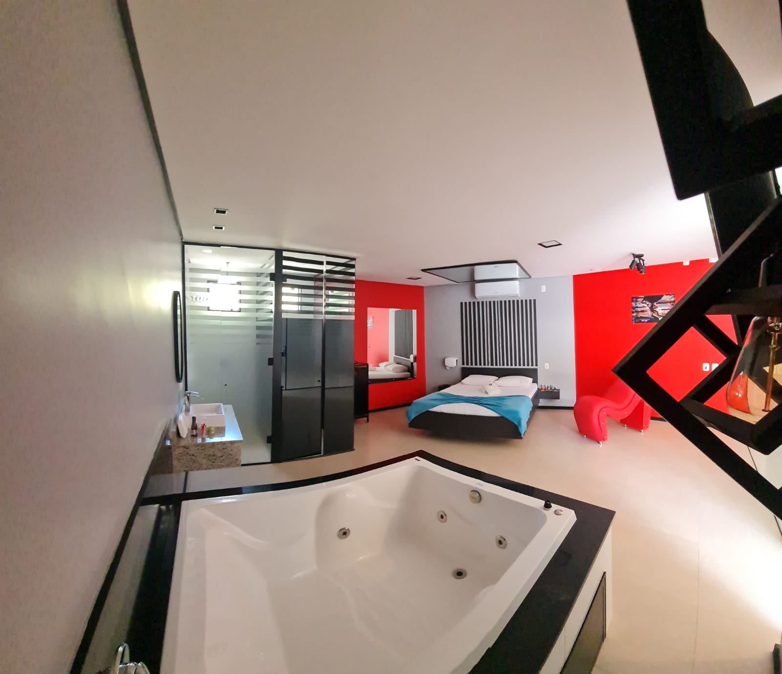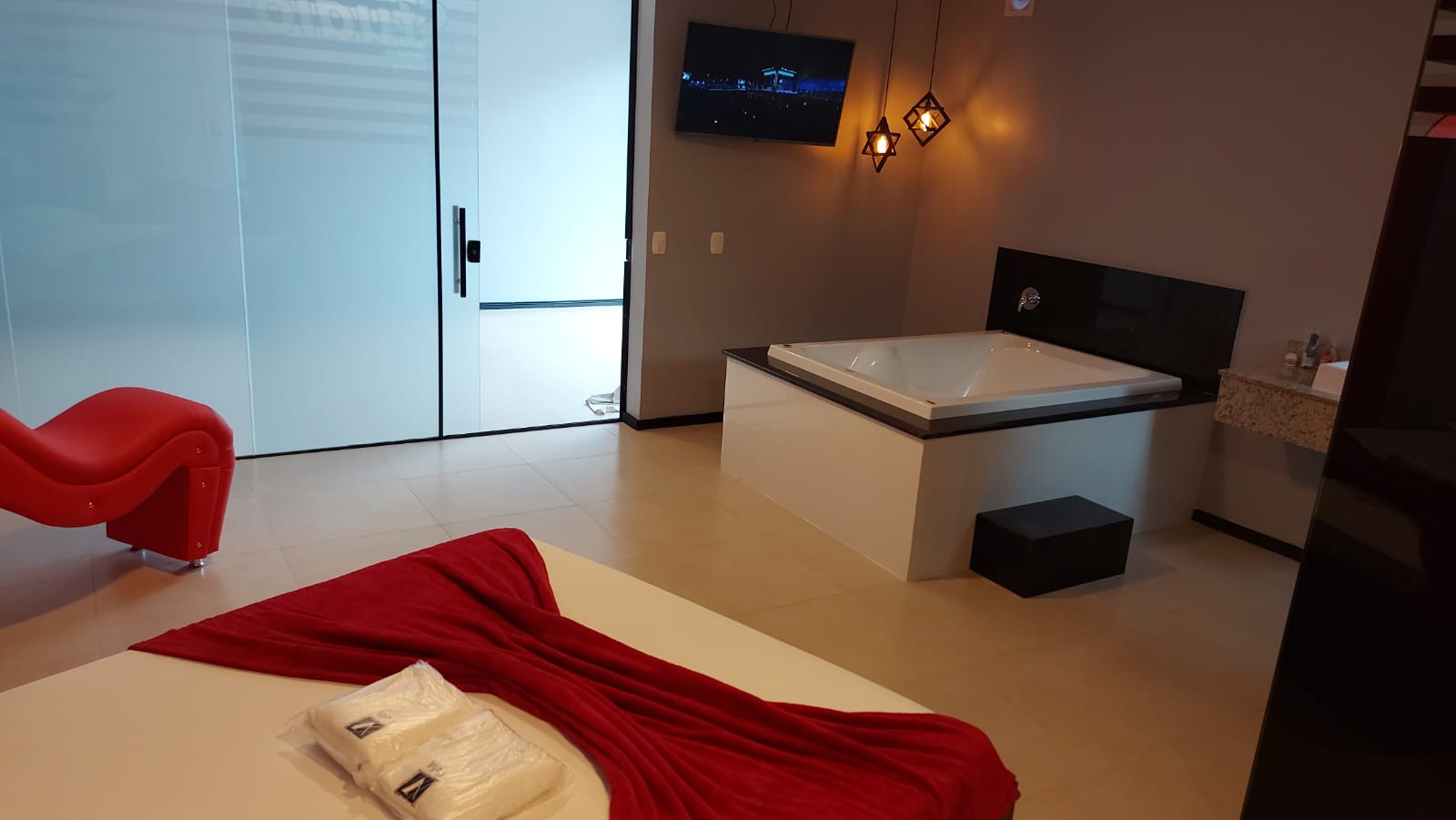 Hidromassagem, ar condicionado, chuveiro de teto, TV smart, frigobar, poltrona erótica, garagem para 2 carros, etc