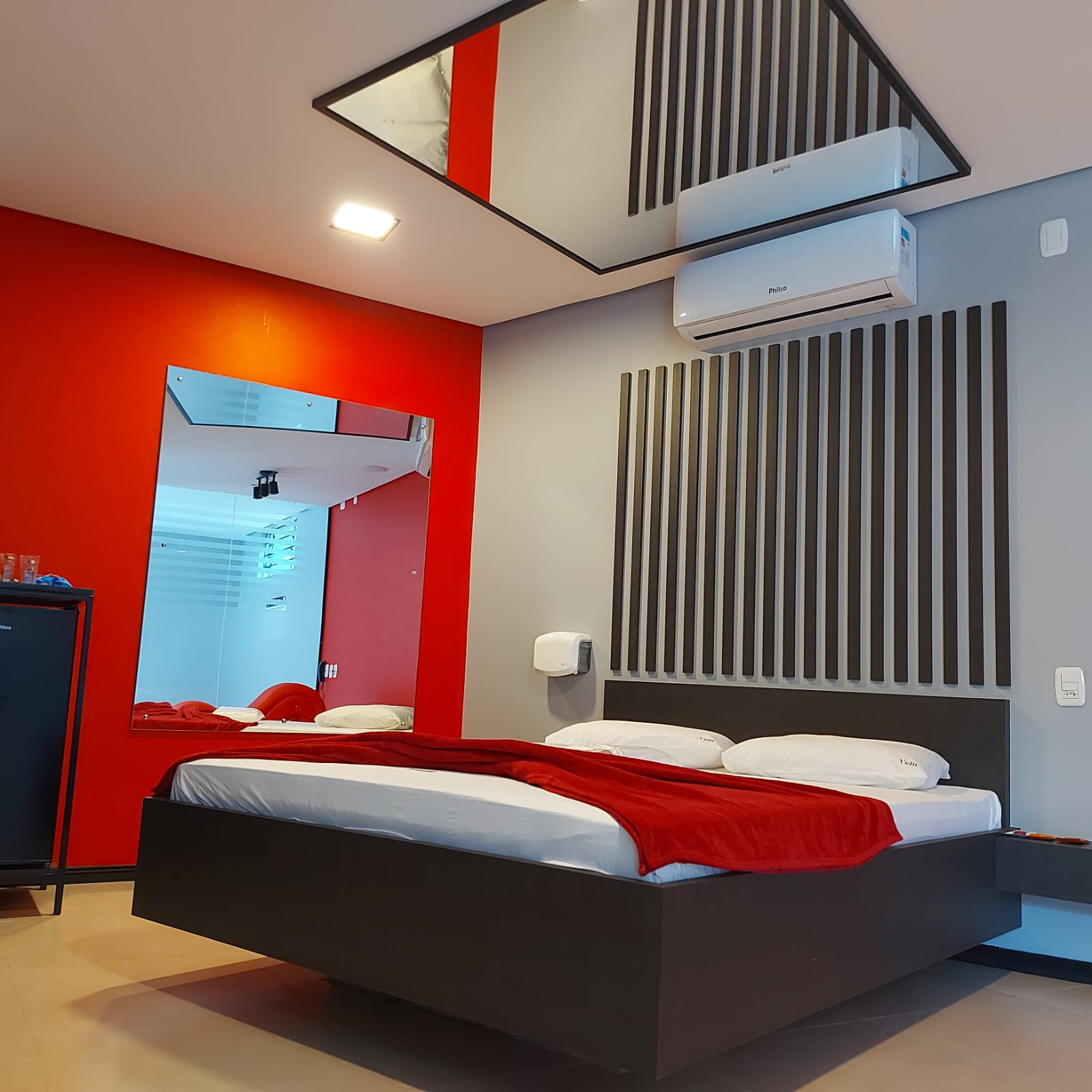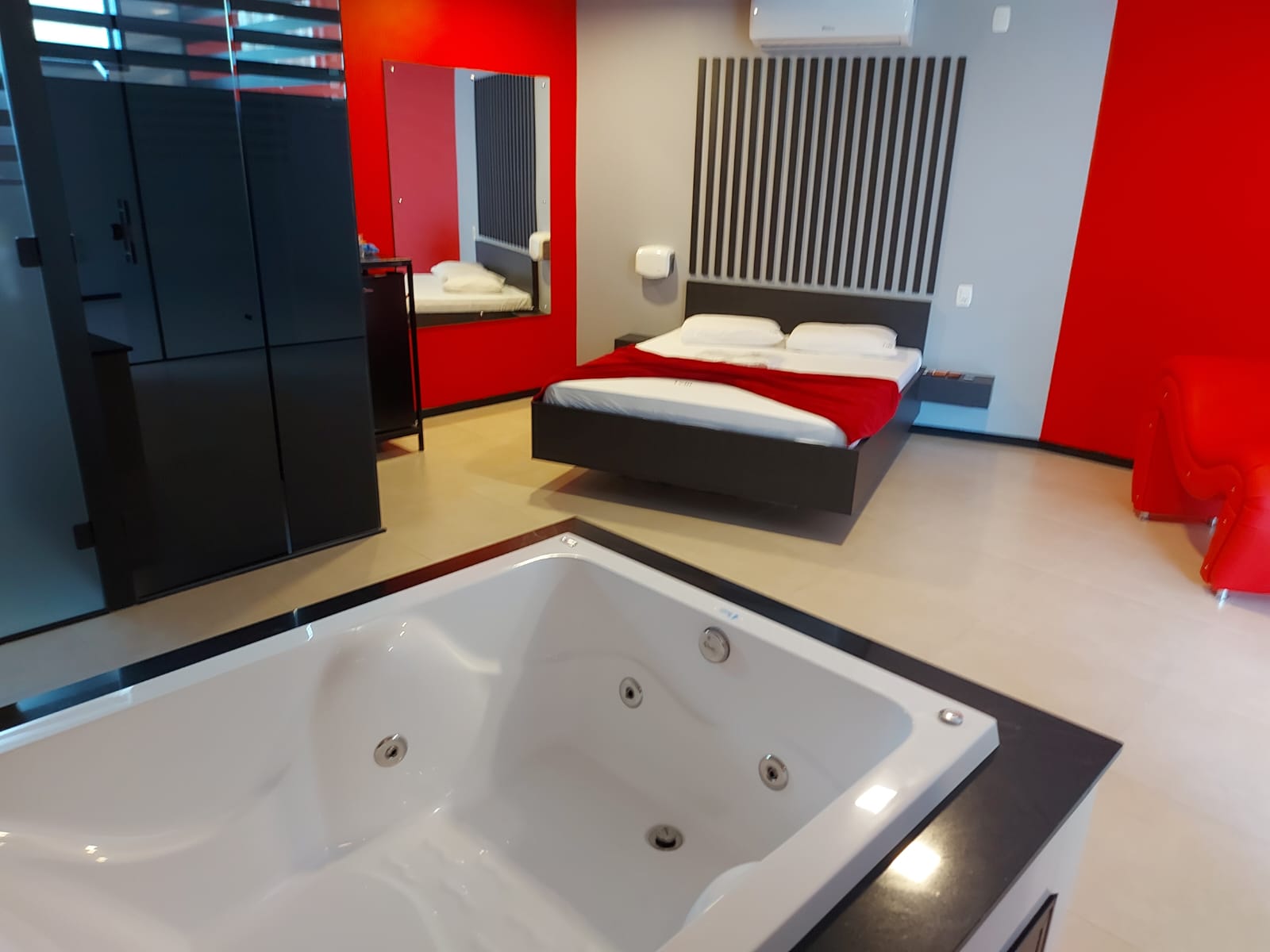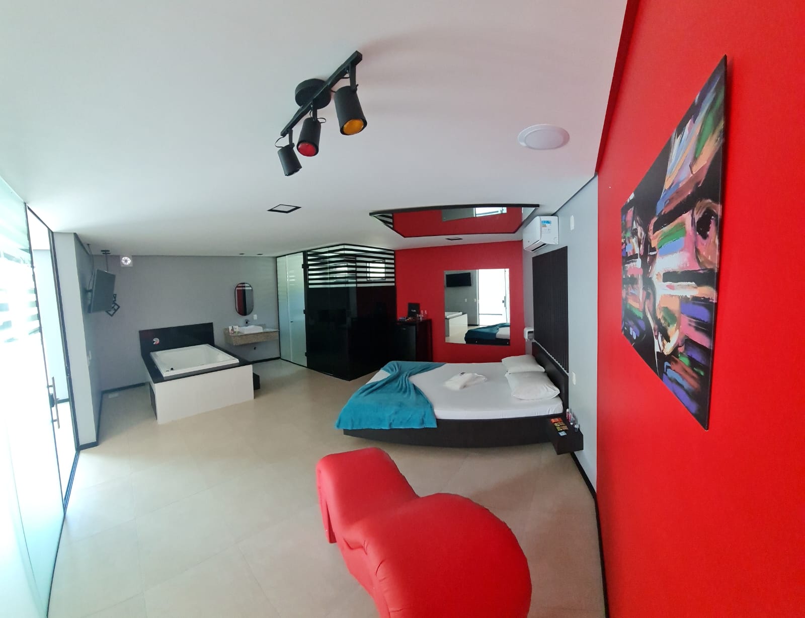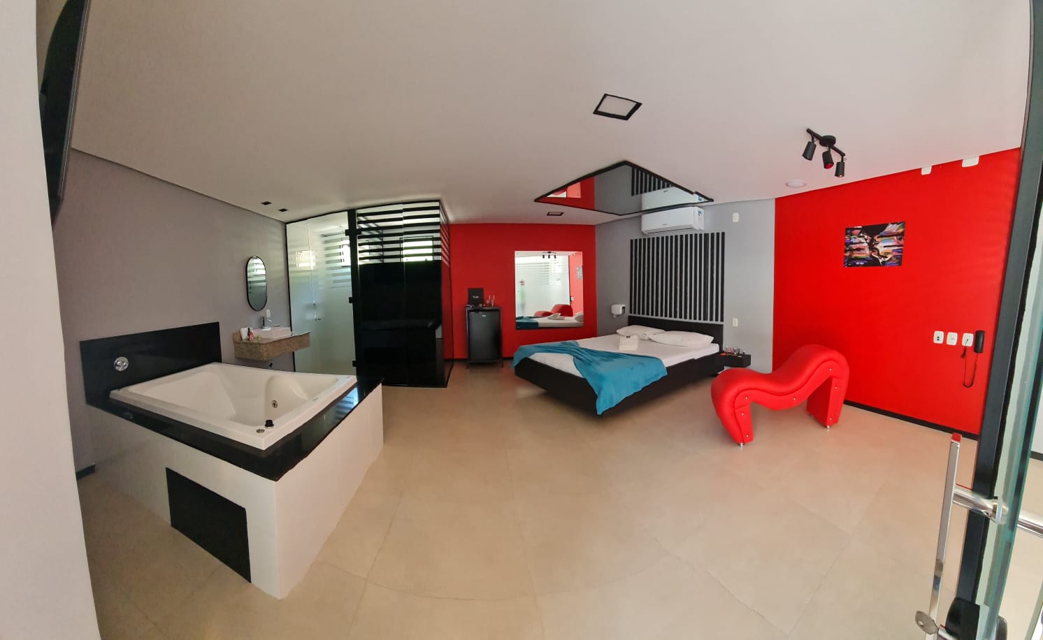 Hidromassagem, ar condicionado, chuveiro de teto, TV smart, frigobar, poltrona erótica, garagem para 2 carros, etc